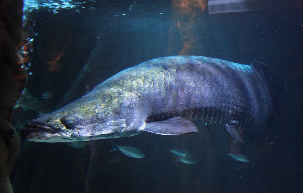 Returning to the Amazon river, you’ll find a colossal dinosaur of a fish – the Pirarucu (arapaima gigas). Growing to nearly 3 meters in length and weighing in at around 220 kilograms, this freshwater giant has a very odd-shaped body, long and narrow in front and flat at the back, with a weird-looking round tail on the end to finish it off.